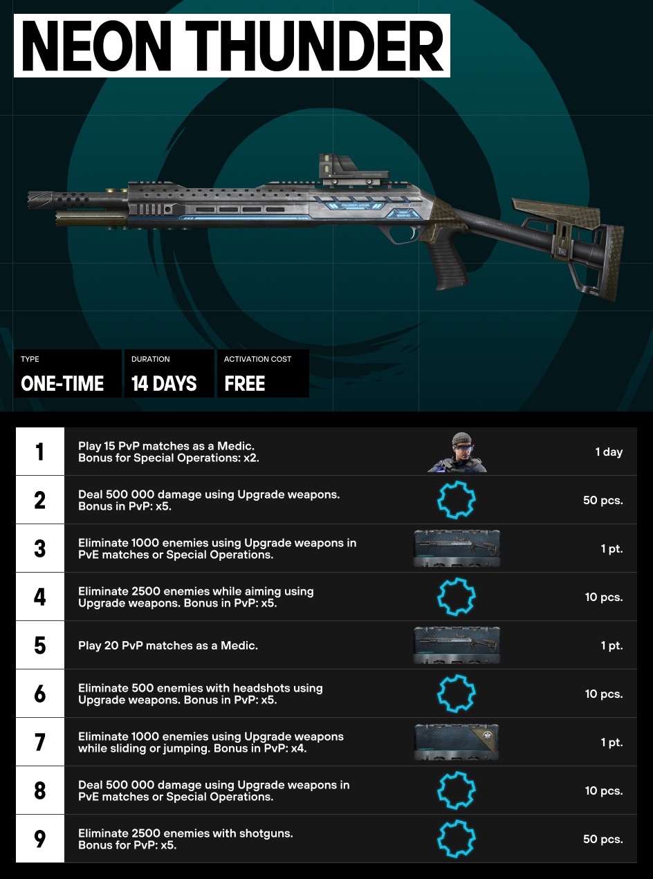 Complete themed contracts to unlock exclusive rewards, including a permanent weapon! Along the way, you’ll earn the temporary PA EG240 and Shi Hao Medic suit boxes. Contract details are available by clicking on the banners below.